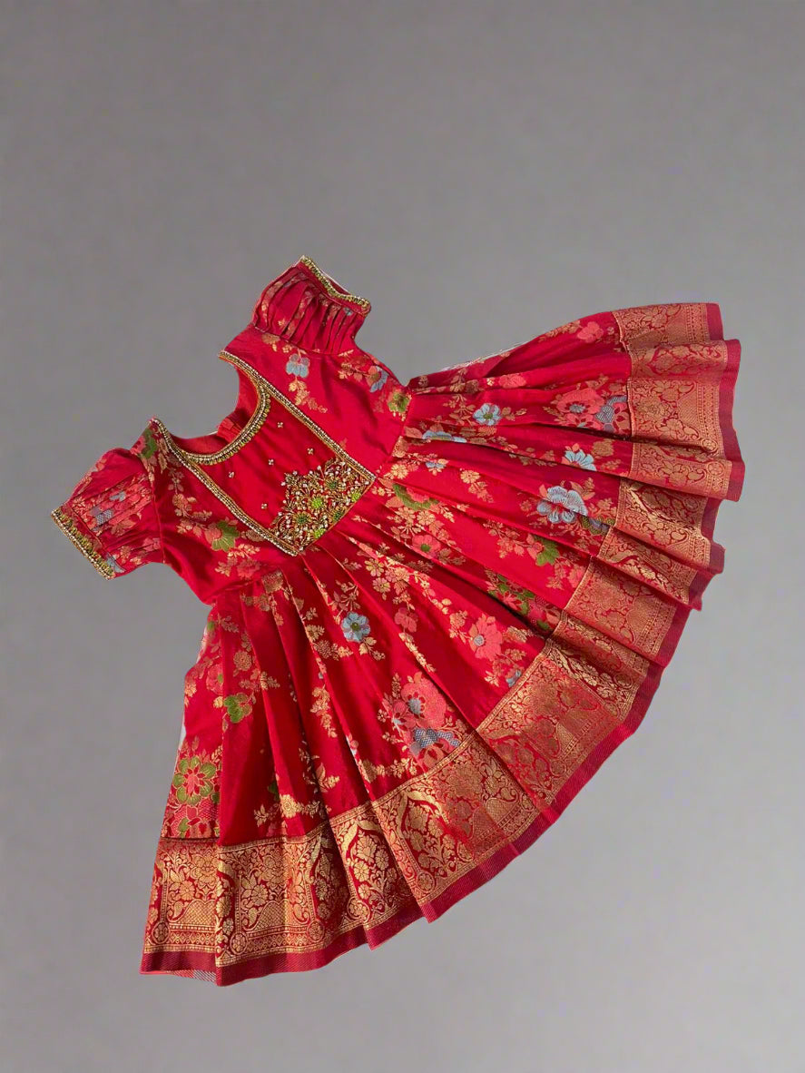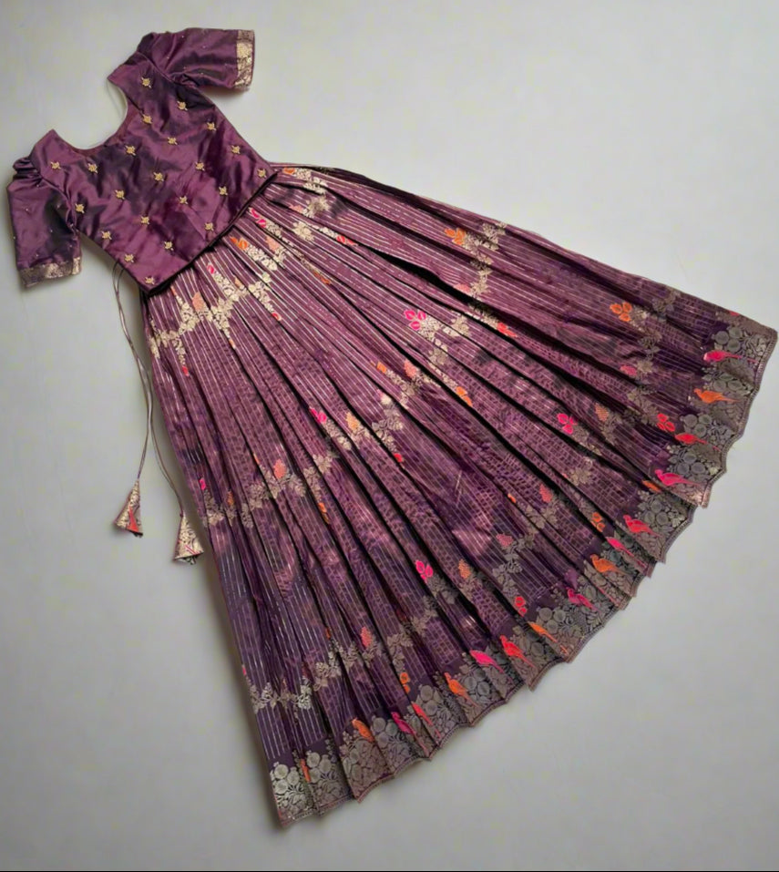 No.of. Components: 2Components: Blouse & Skirt Pattern : Pavadai Sattai Type of Work: folded Frills With waist Bold works filled with Flowers Neckline:...