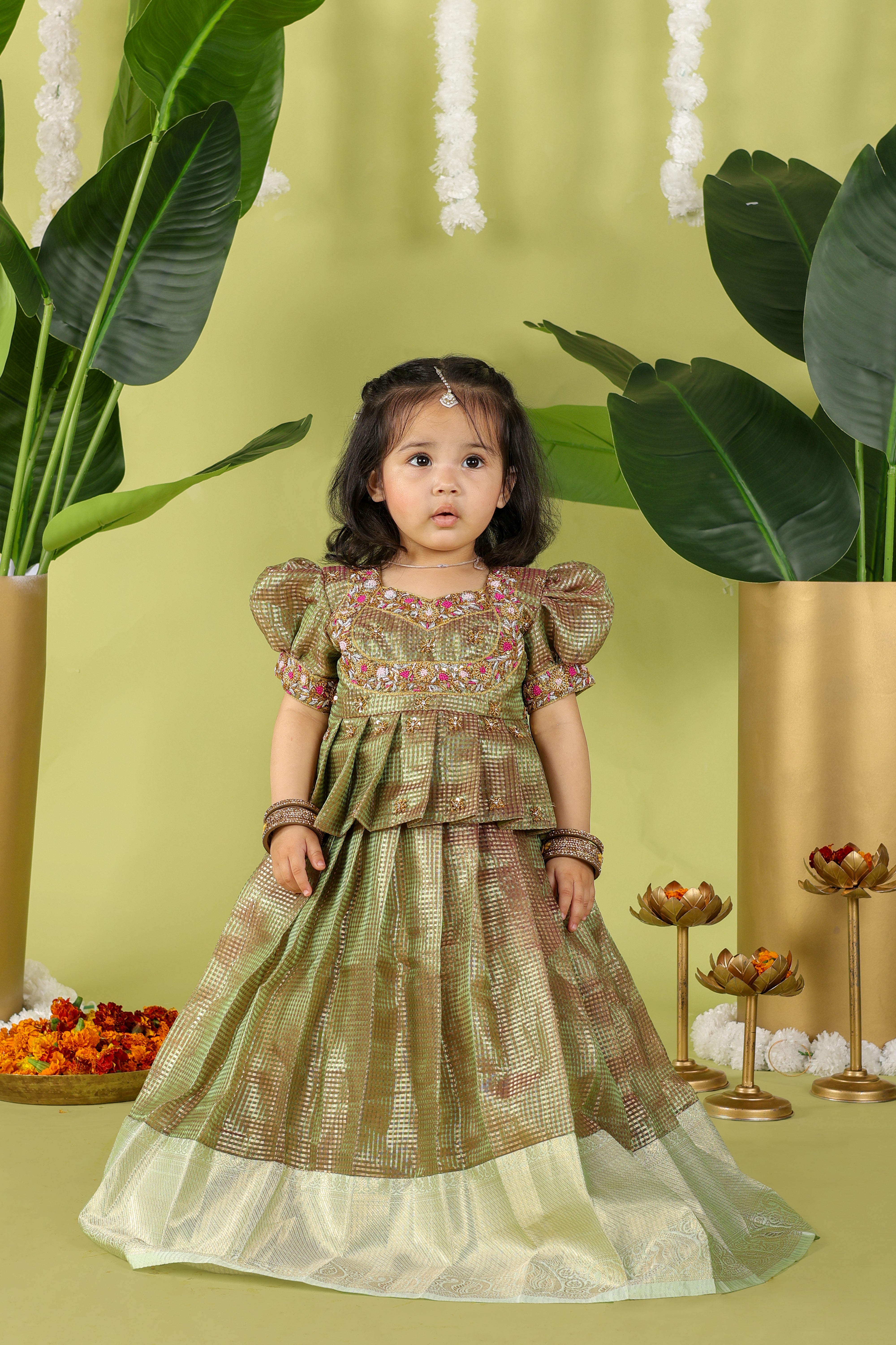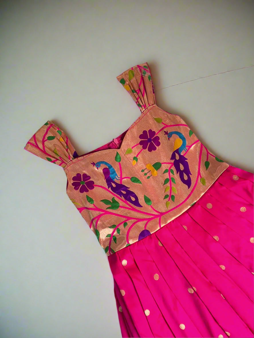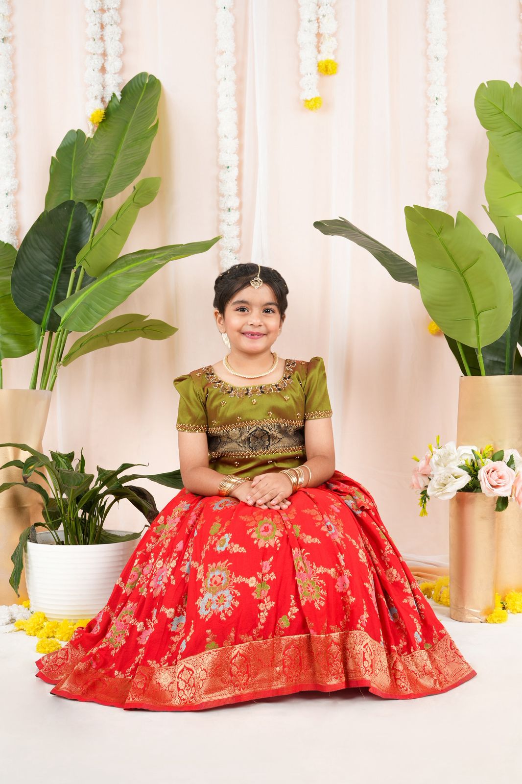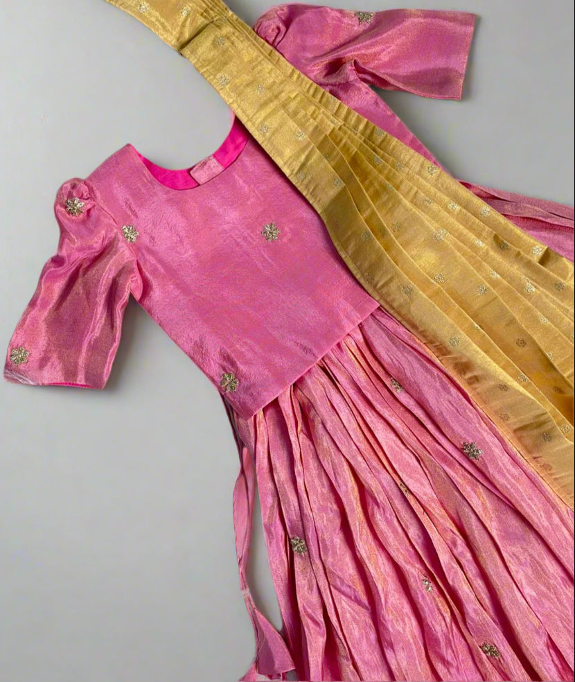 No.of. Components: 2Components: Blouse & Skirt Pattern : Pavadai Sattai Type of Work: folded Frills With waist Bold works filled with Flowers Neckline:...