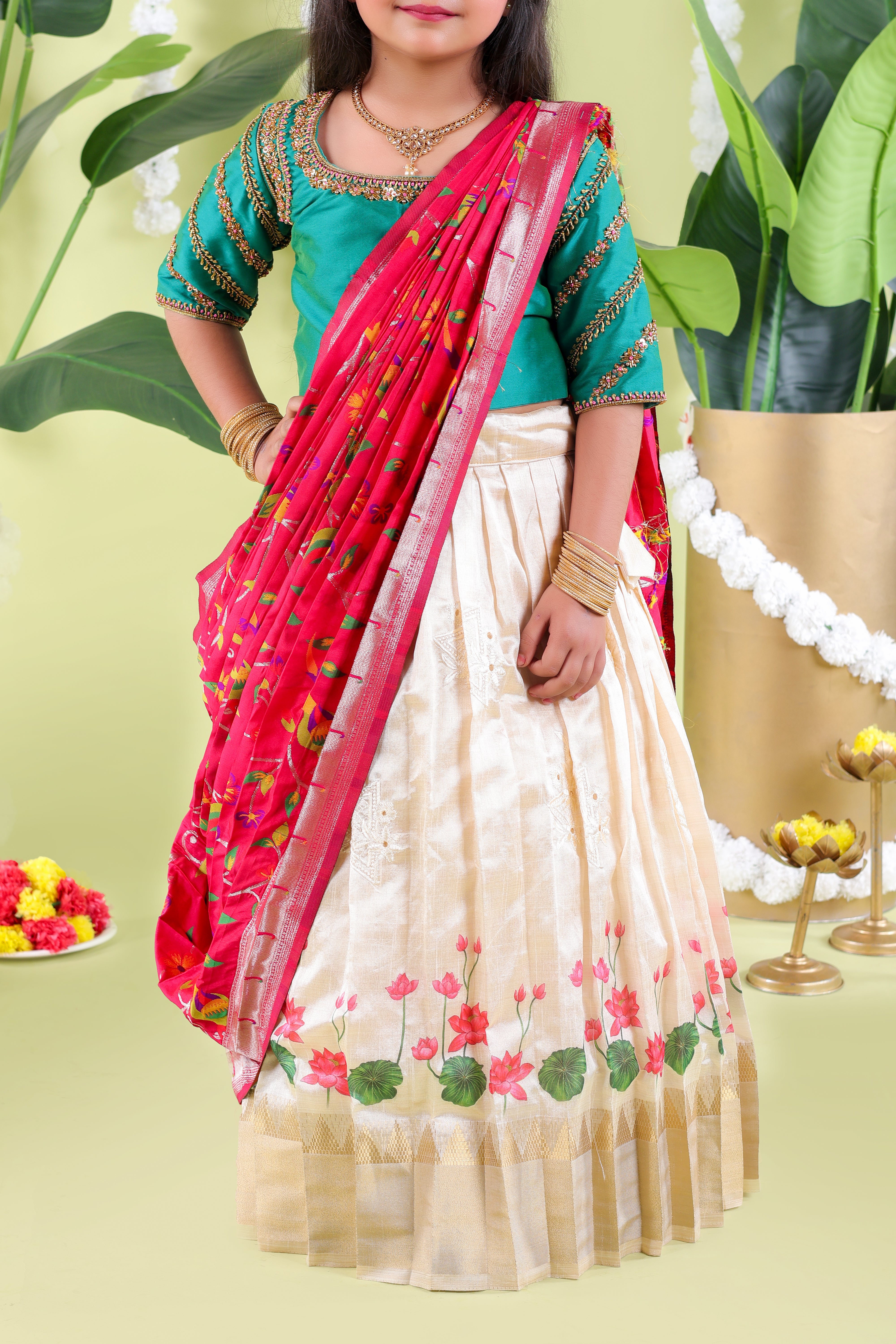 No.of. Components: 02 Components: Top & Skirt Pattern : Pavadai sattai SetType of Work: White and gold aari work on neckNeckline: Sweet...