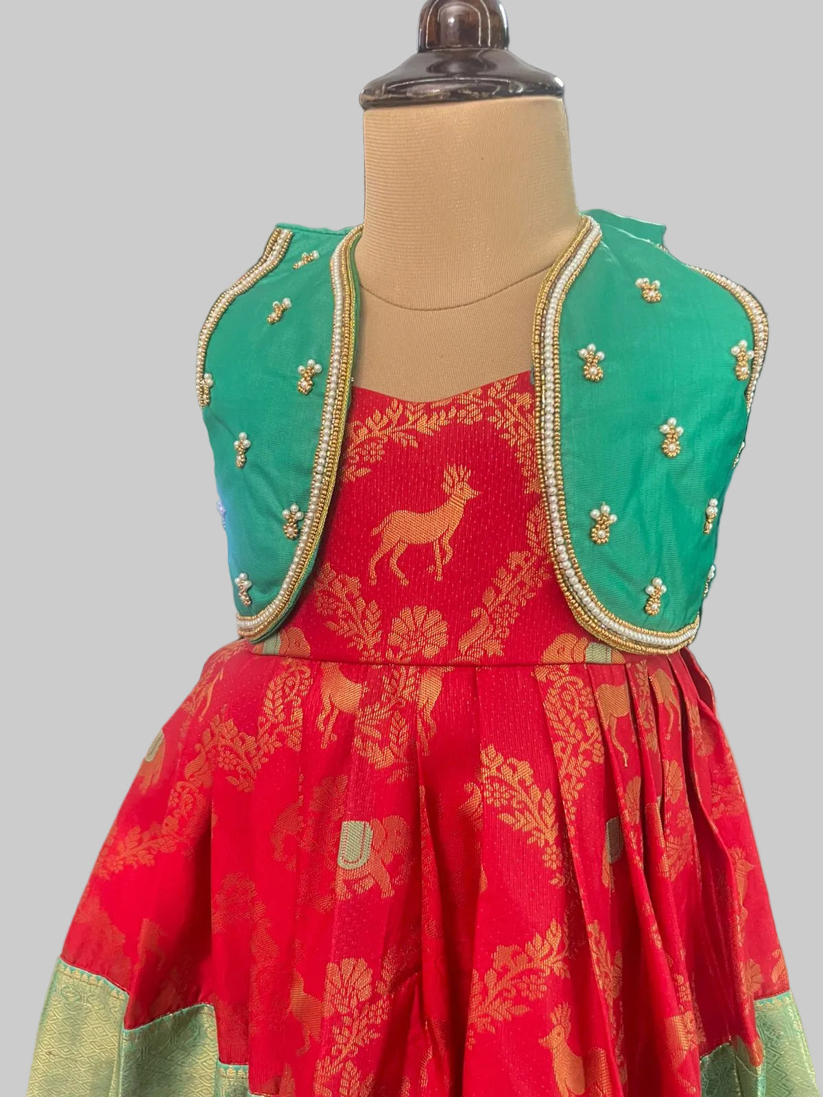No.of. Components: 2 Components: Petticoat & Blouse Pattern : Overcoat Pattern Type of Work: Front open Round Cut overcoat with Outline highlighted Aari...