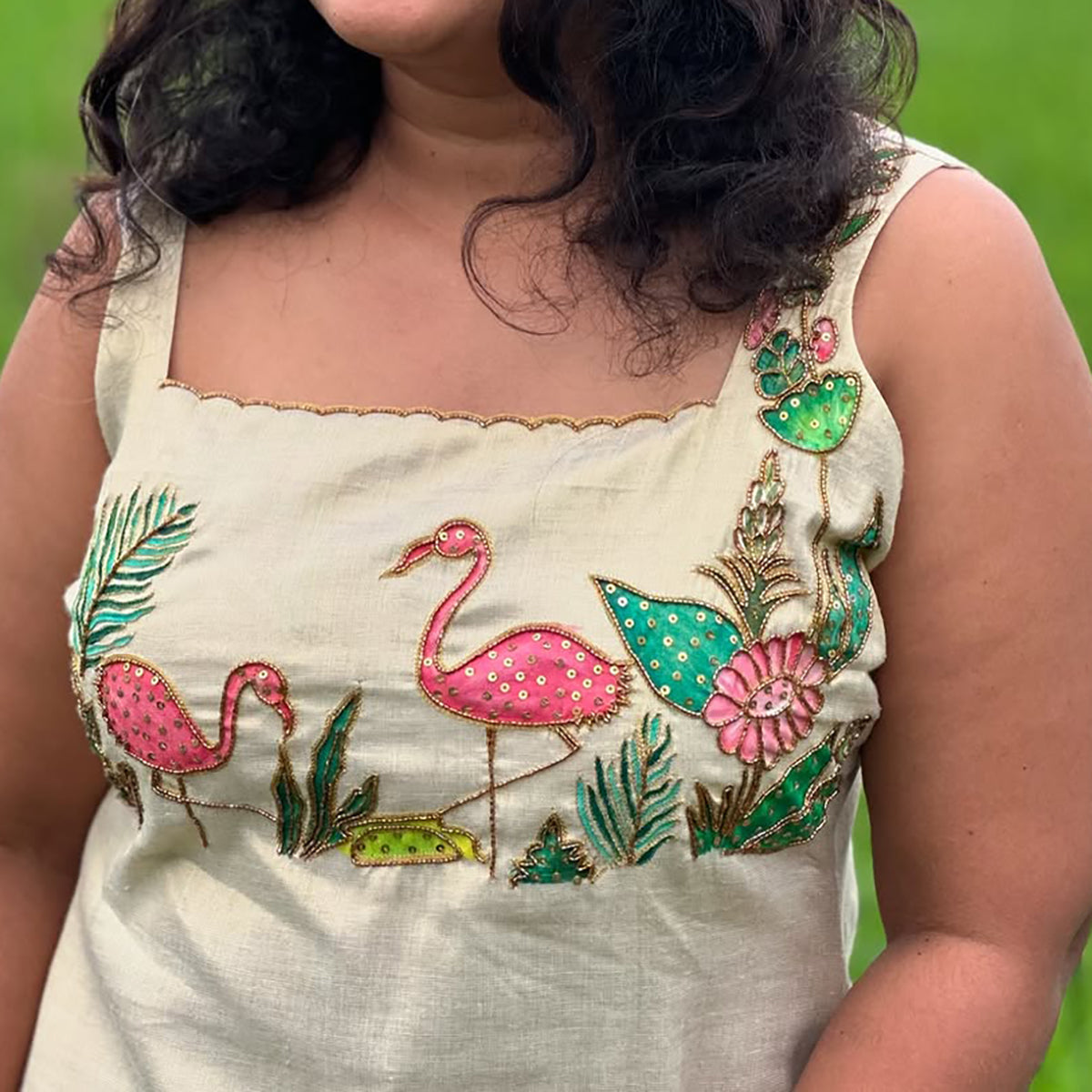 No.of. Components: 3Components: Kurti , Set & Duppata Pattern : Painted Kurta Set Type of Work: Painted Flamingo Neckline: scalloped Square NeckSleeve type:...