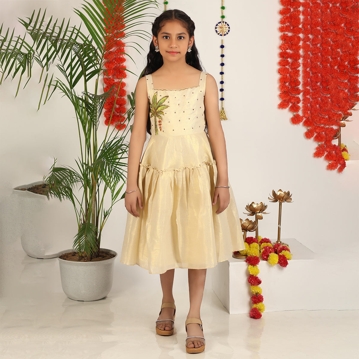 No.of. Components: 1Components: GownPattern : Mid length gownType of Work: Layered Gown With BANANA LEAF Painted & Highlighting Aari works Neckline:...