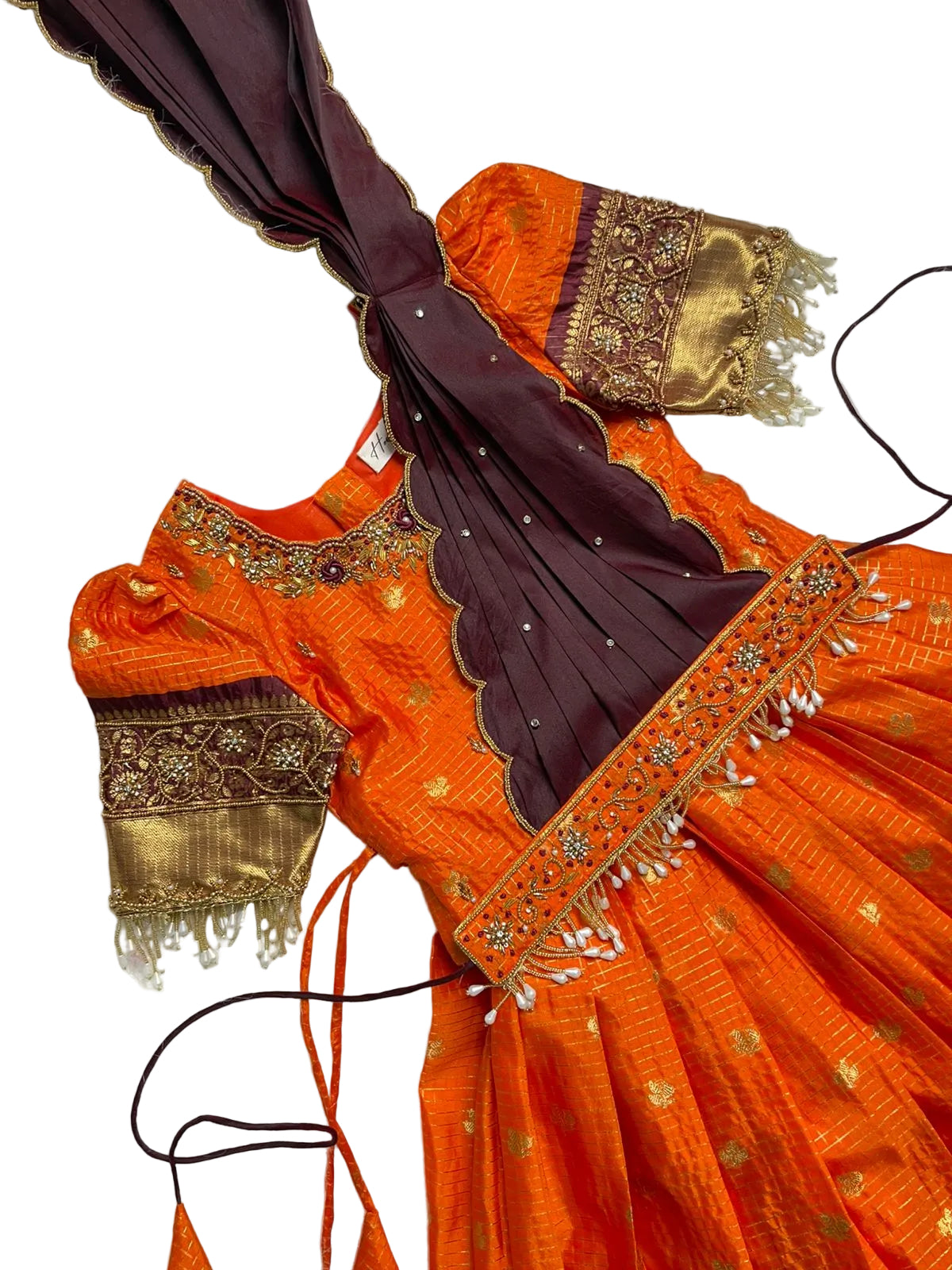 No. of. Components: 3Components: blouse, petticoat & Dupata Pattern : Type of Work: Scalloped aari work on dupatta with attached hip belt...
