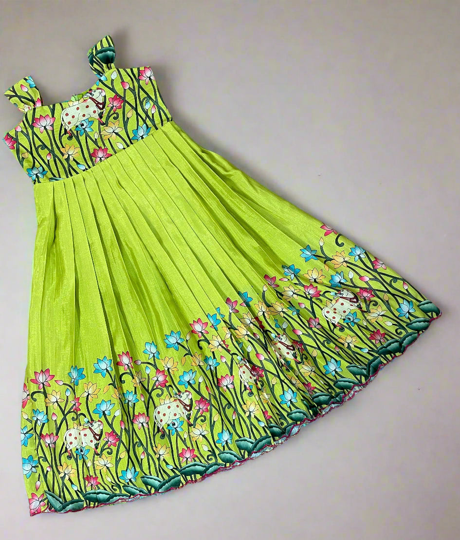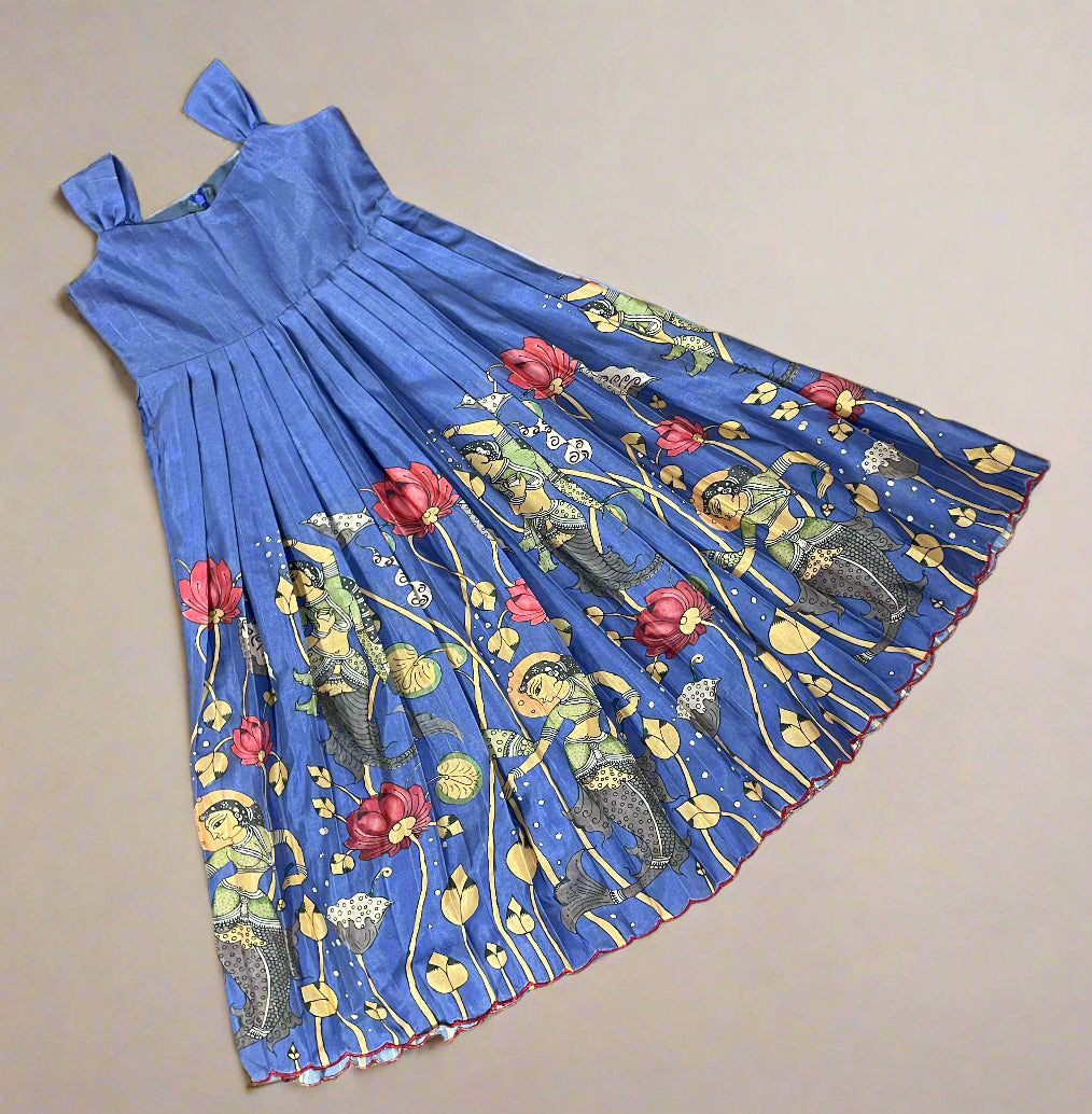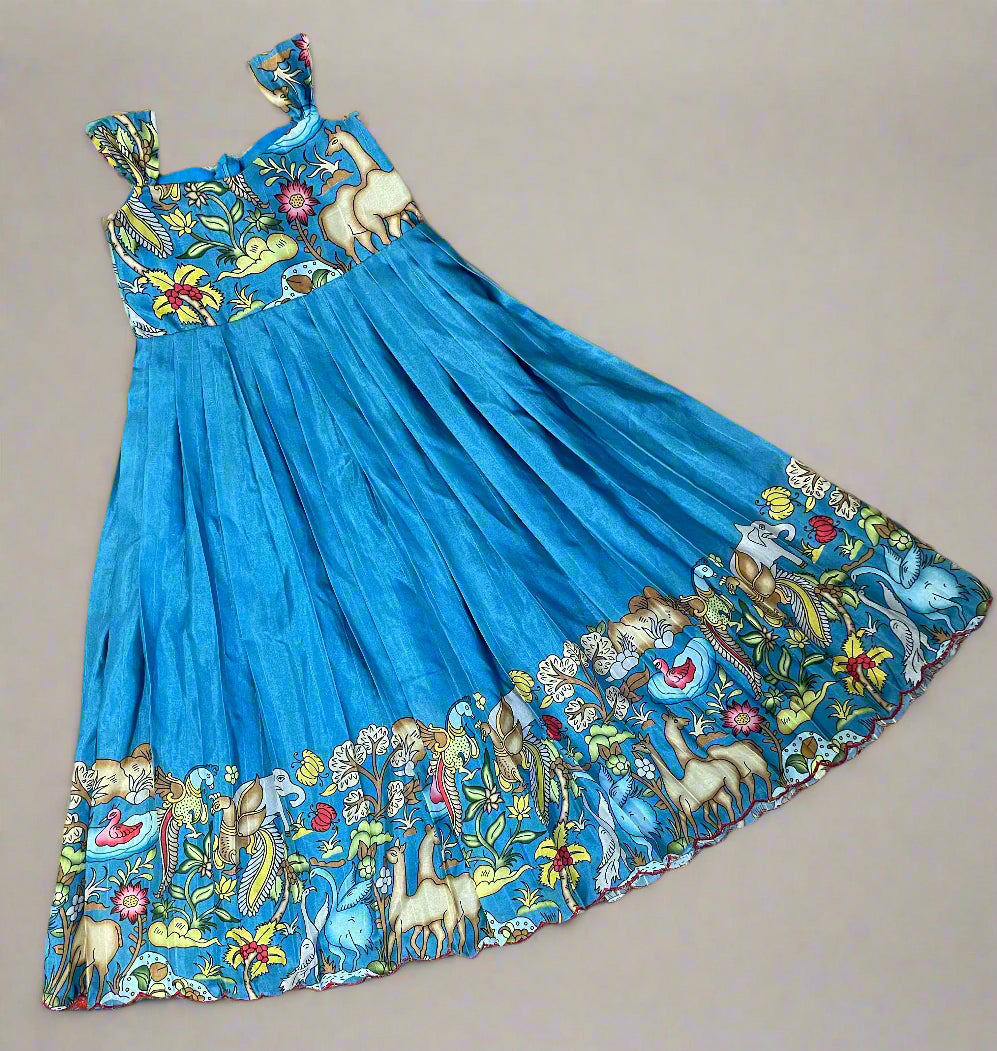 No.of. Components: 1Components: Gown Pattern : Full length GownType of Work: printed kalamkari scalloped gown Neckline: v-neckSleeve type: Sleeveless Fabric: Tissue cottonLining: Soft...