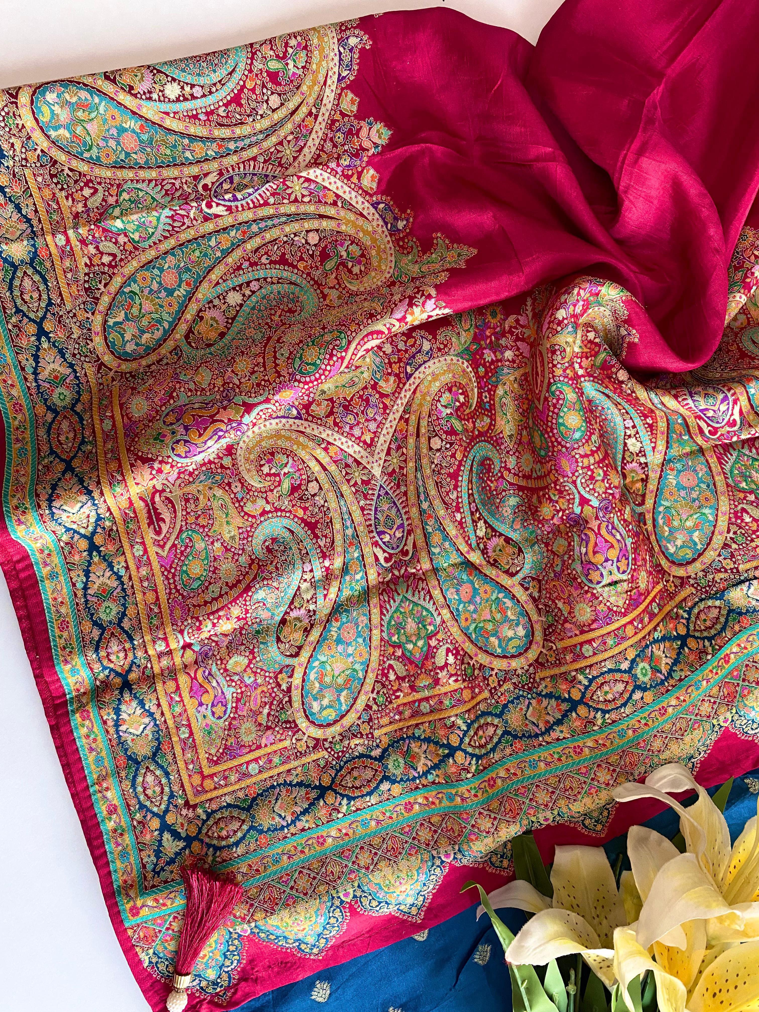 Pure Moonga silk with kashmiri placement weaves.Light weight and falling.