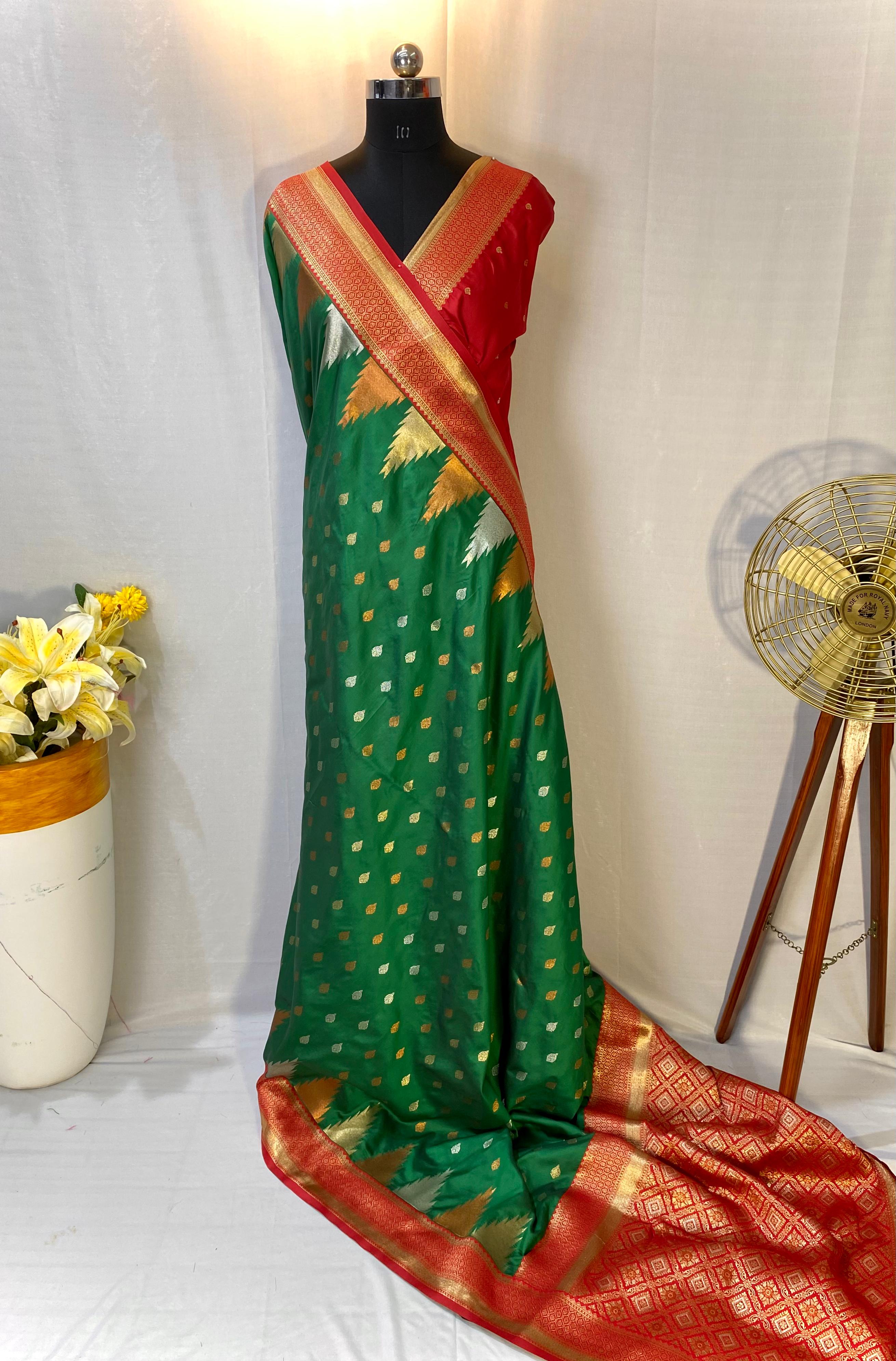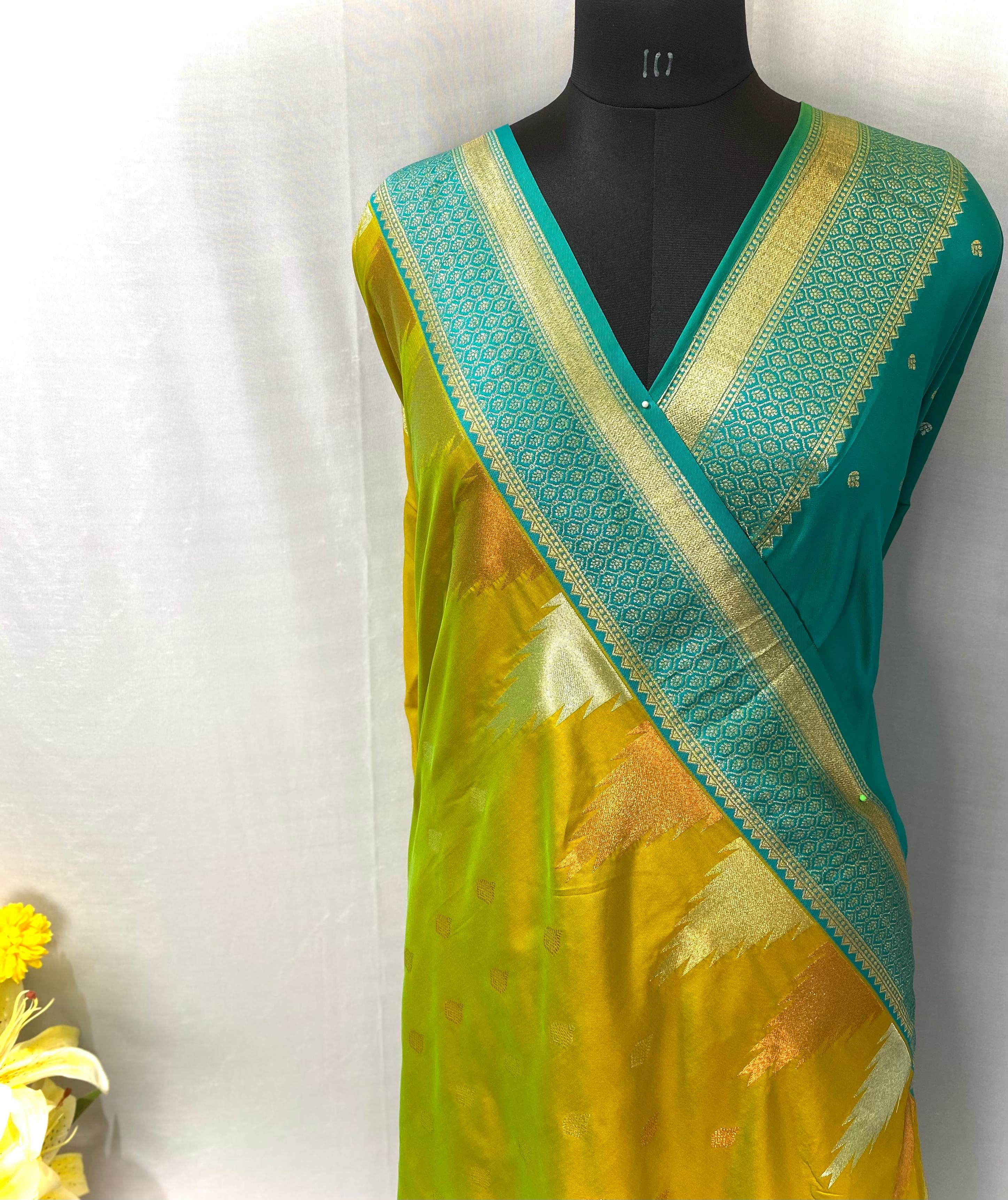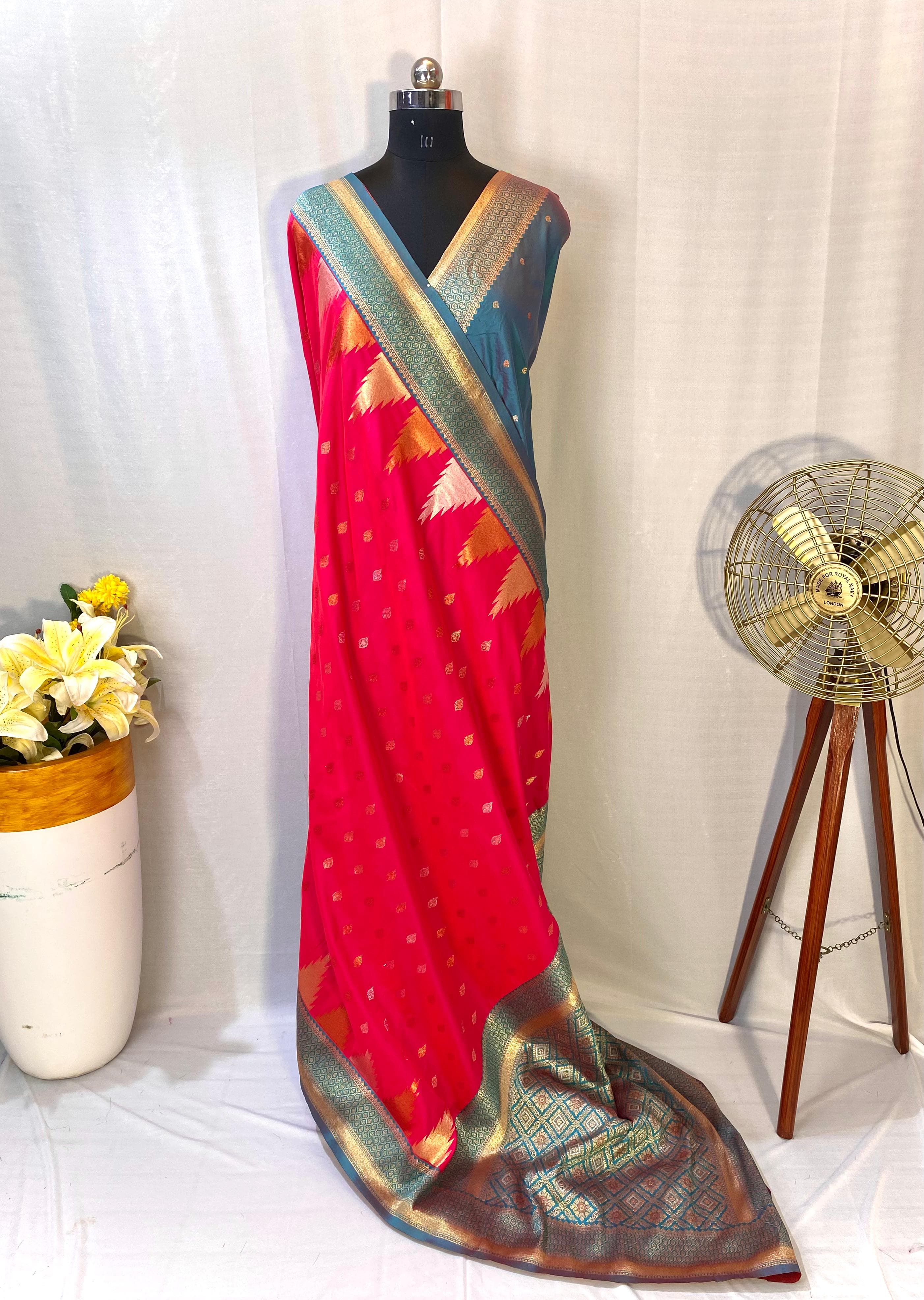 Description - Dual tone silk sarees with all over zari weaves, Contrast pallu and designer chaap border.Tassels attached.