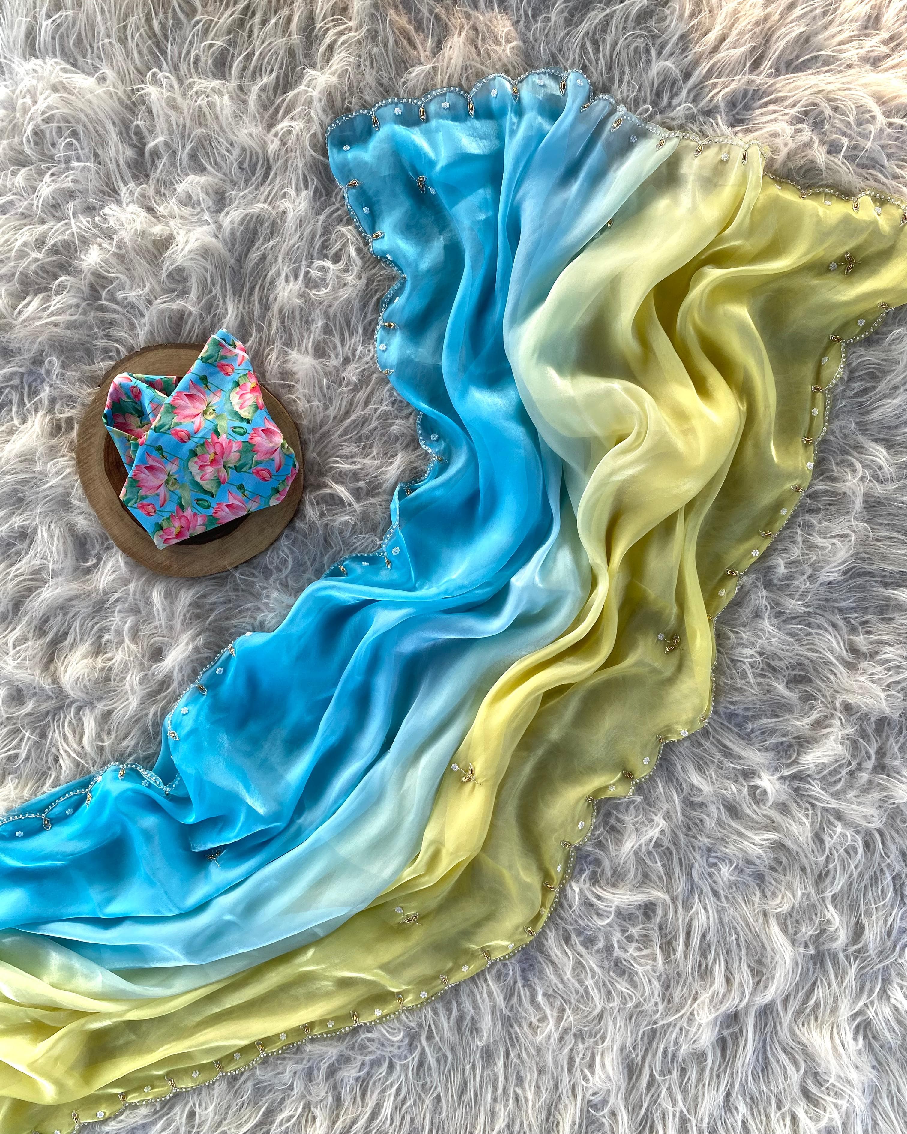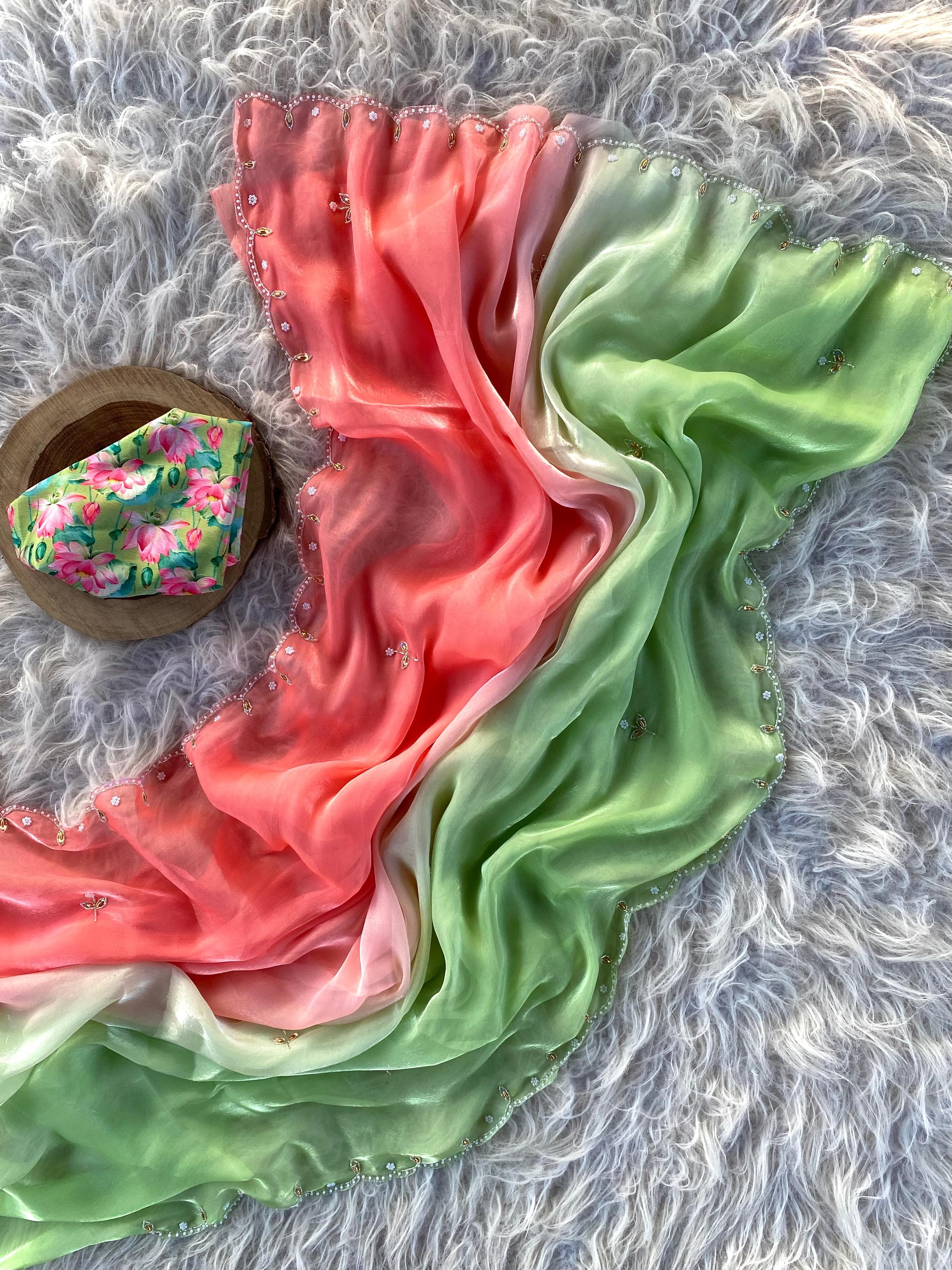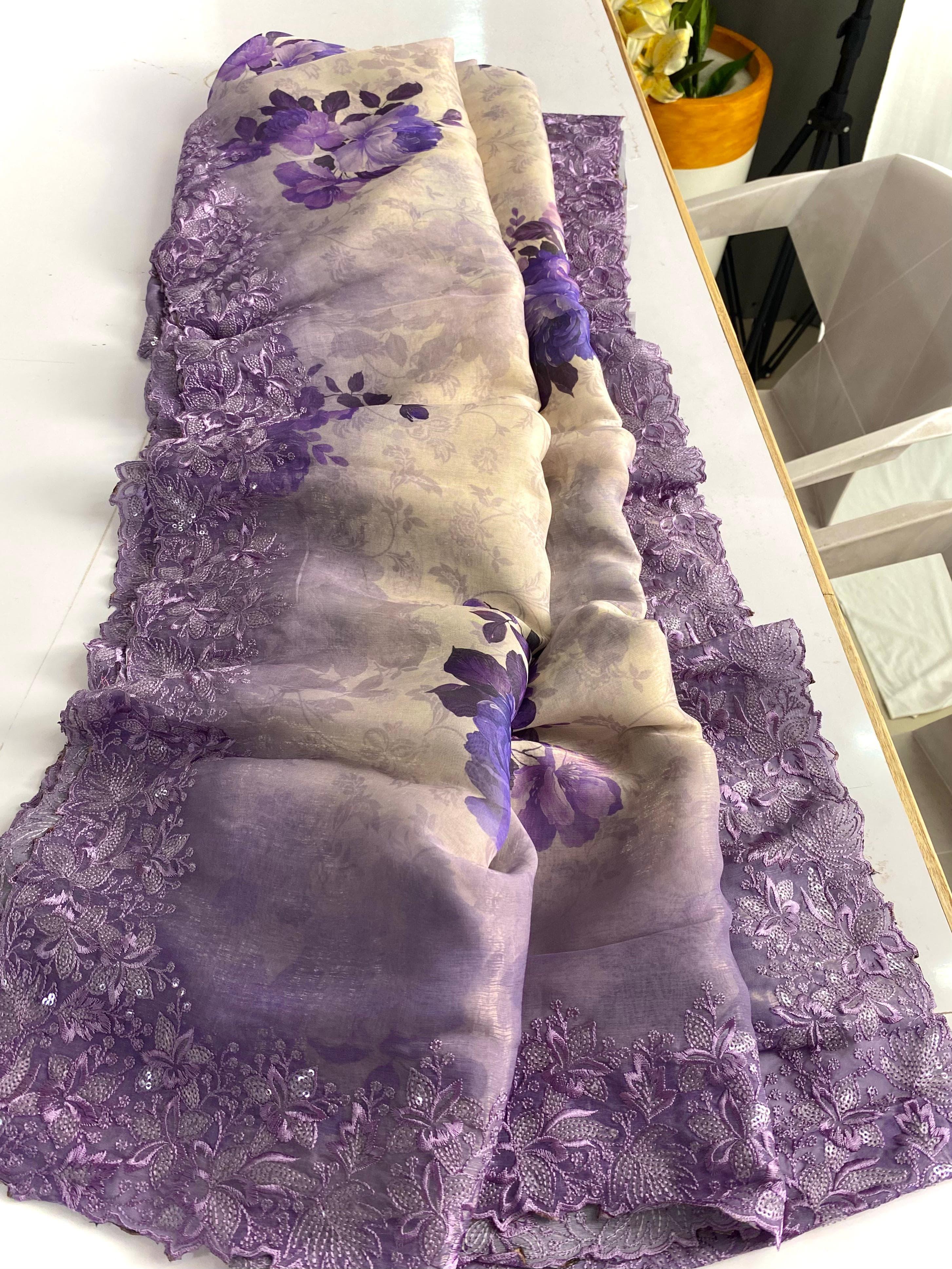 🥻👉🏻Description - Hand crafted magicgold organza sarees with all over digital print and viscose - sequins embroidery on the saree...
