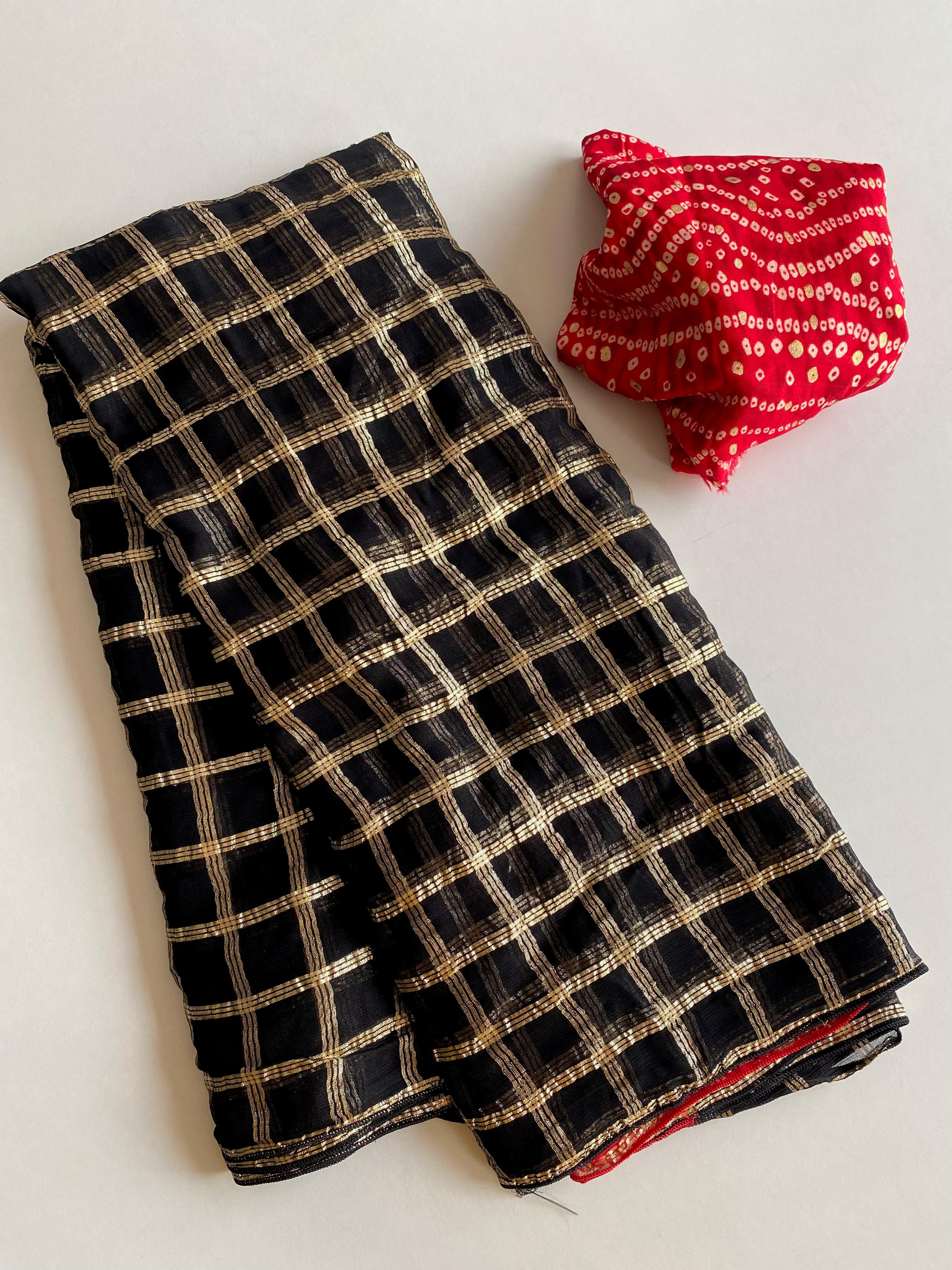 Description: Natural viscose zari chex sarees with all over shibori dyeing with beautiful and exclusive tassels.With a Contrast bandhej Blouse...