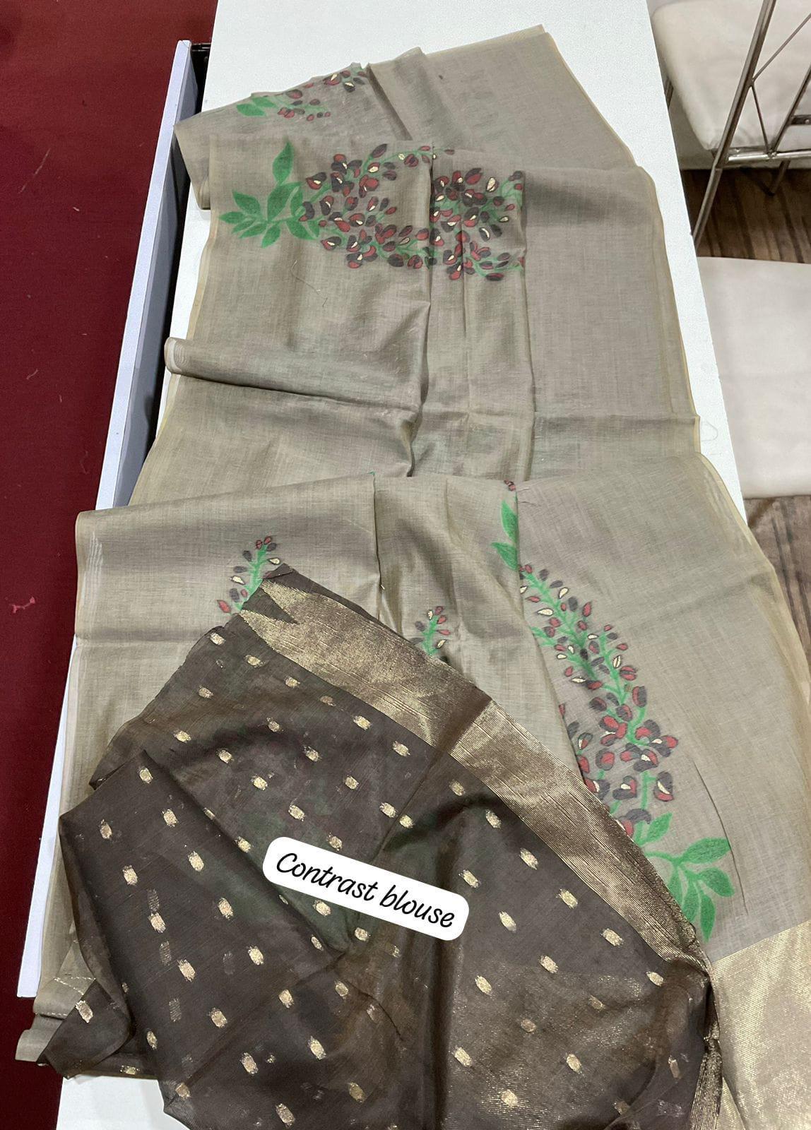 Premium soft muga silk saree with all over unique floral weaving pattern with small zari patta on pallu with classic...