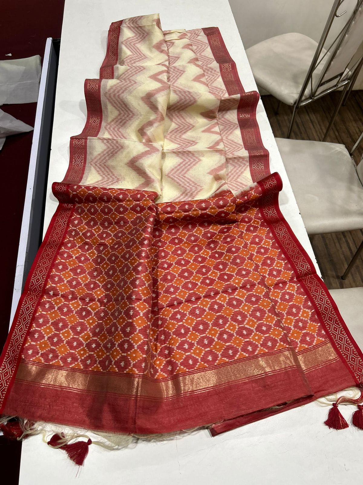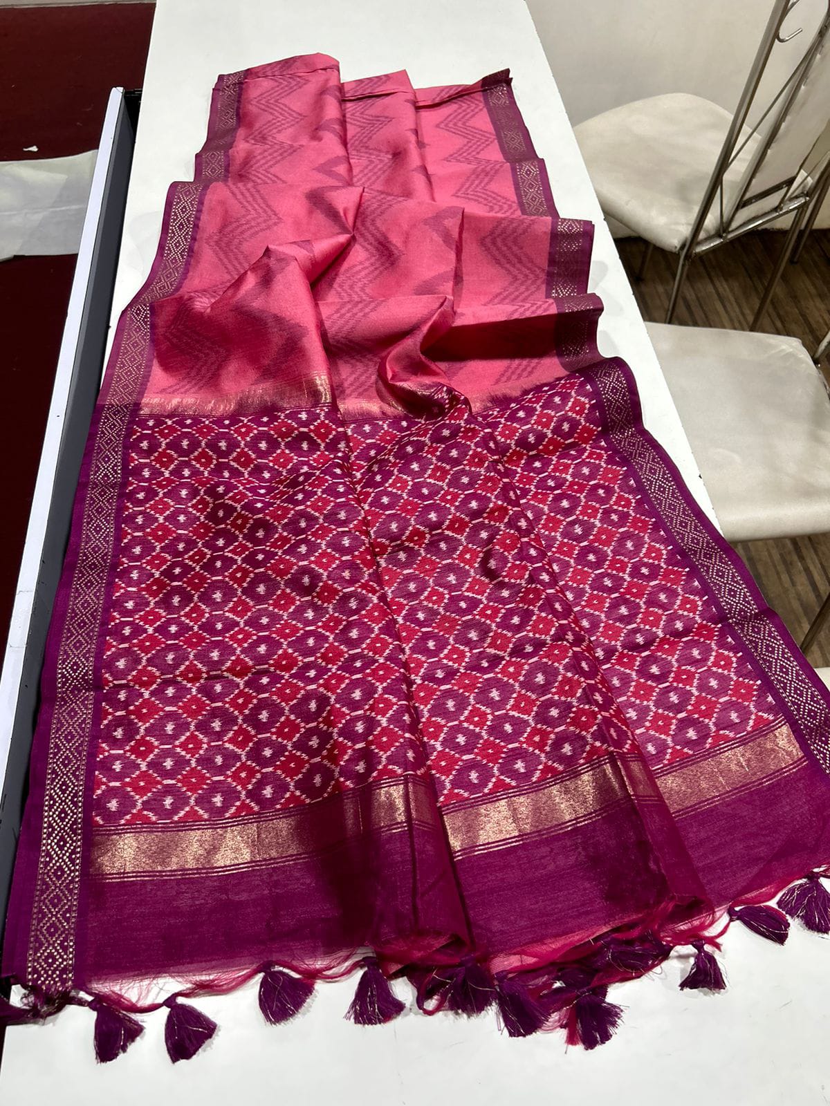 Description - Dual tone silk sarees with all over zari weaves, Contrast pallu and designer chaap border.Tassels attached.