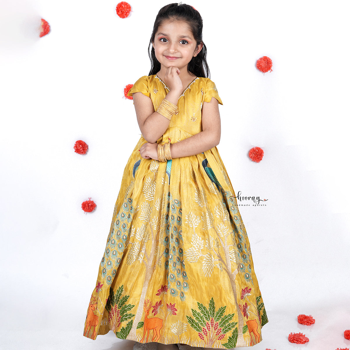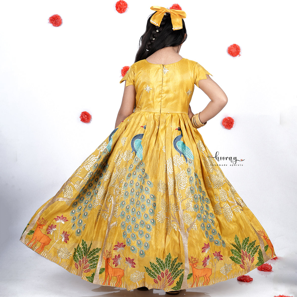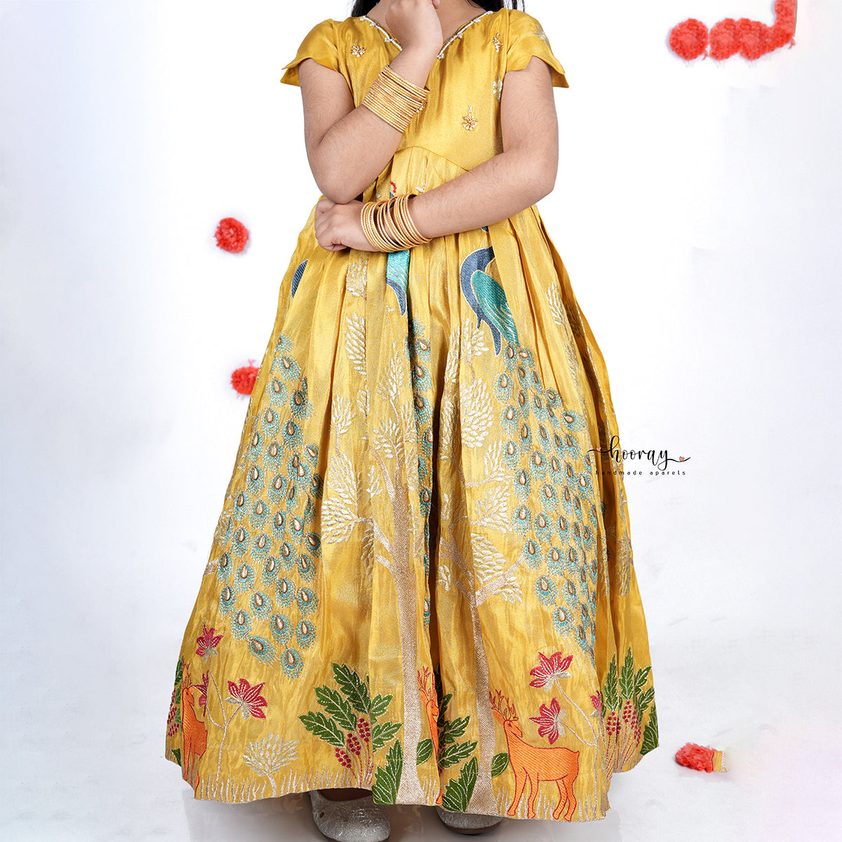 Type of Work: Full Gown with swallop work on Neck line & Embroideried Peacock print on Fabric