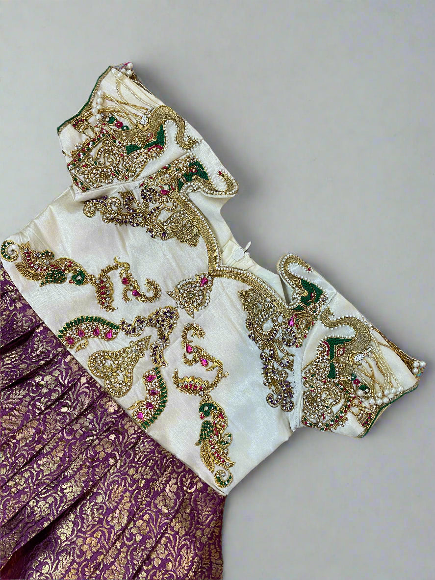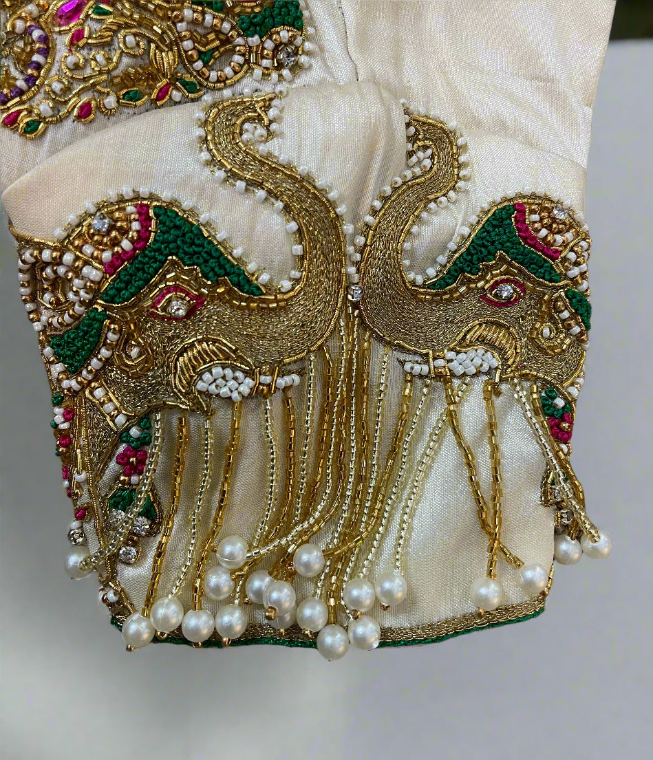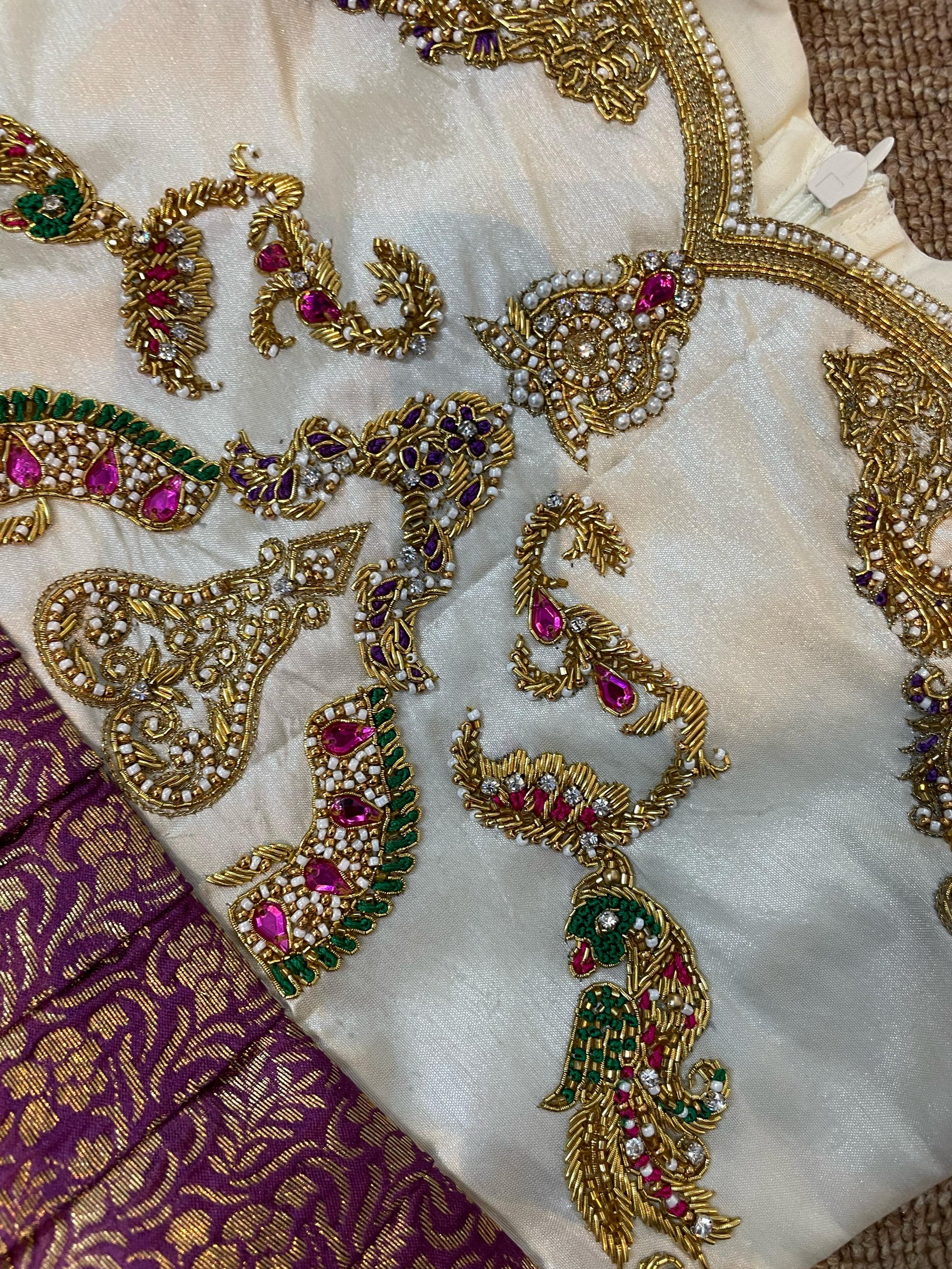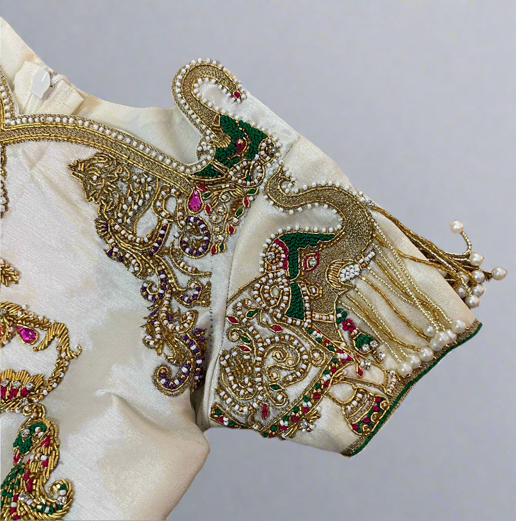 Type of Work: Intricate Aari work inspired by the majestic Pradeeshwara Temple sculptures, bringing Chola culture.