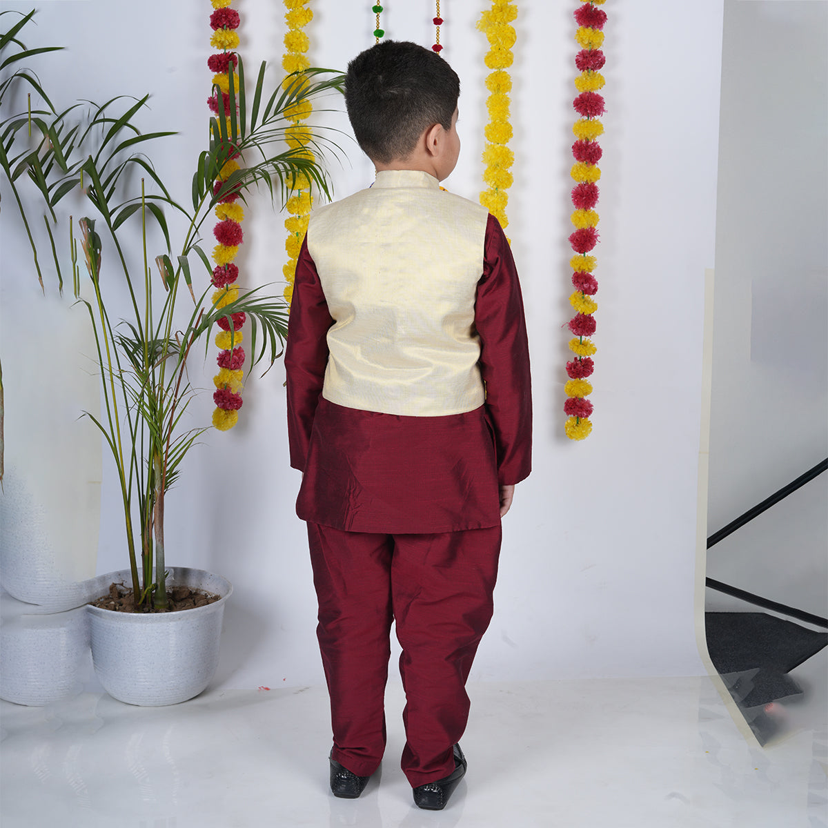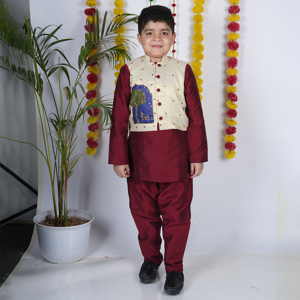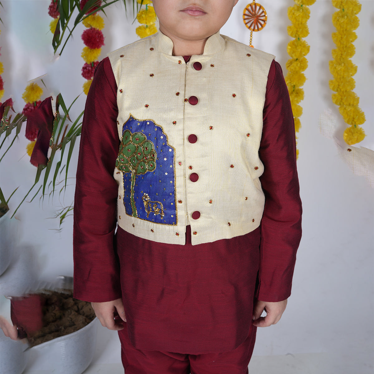 Type of Work: Knee length kurta with matching Pant & Sleeveless Painted overcoat