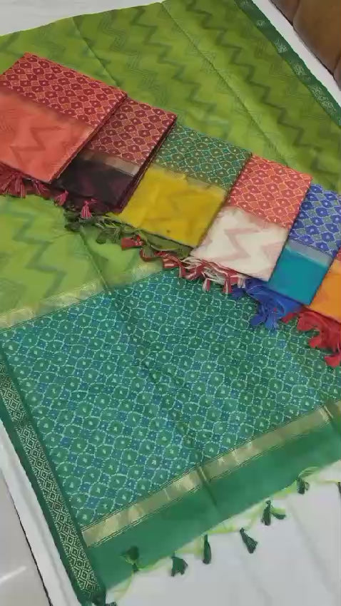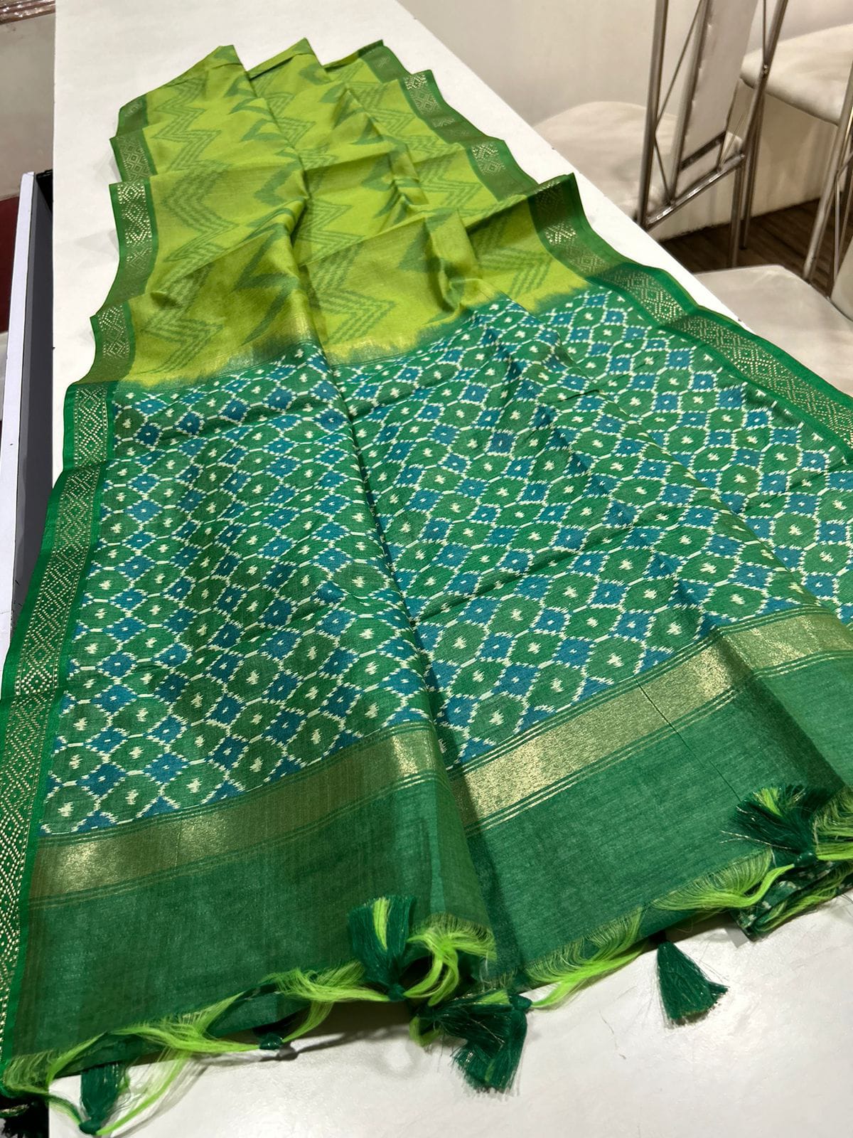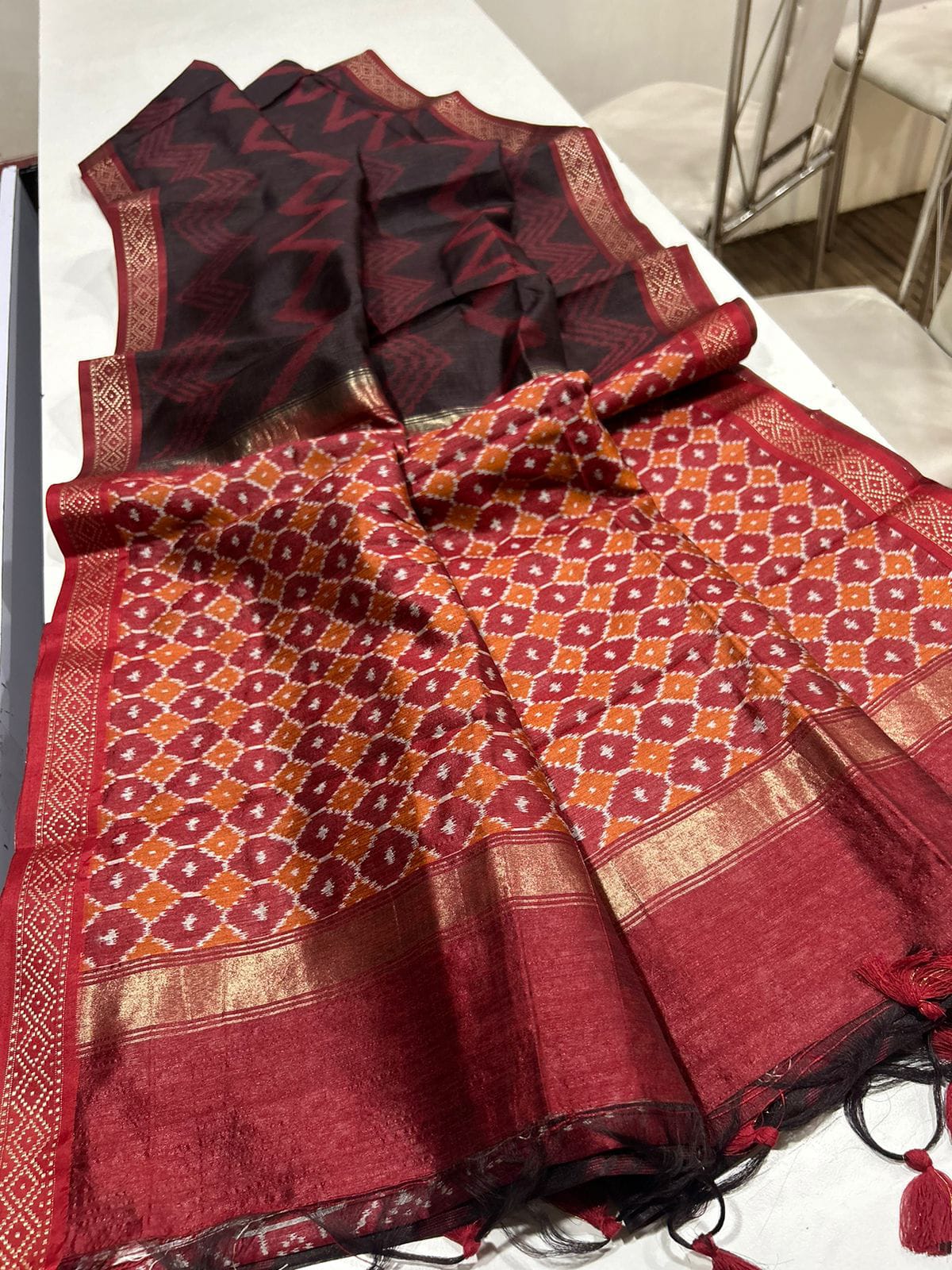 Soft Desi Tussar silk saree with all over laheriya (zigzag) pattern and traditional rich ikkat pallu with tiny contrast zari woven border and fancy tassels with contrast fully ikkat weaves blouse piece