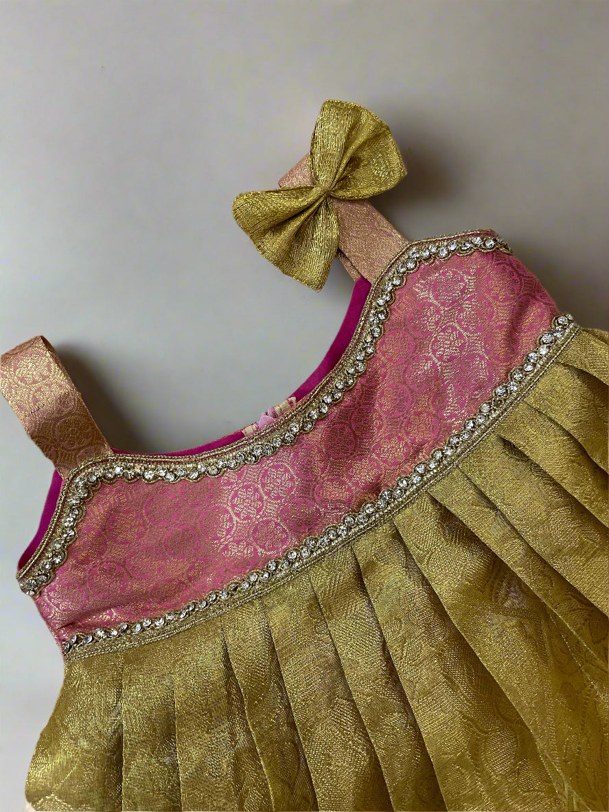 Type of Work: A cute little bow on left shoulder with lace work on yoke area ; ruffled frill work on bottom of frock